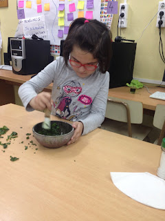 Después nos pusimos manos a la obra con un experimento para extraer la clorofila de las hojas de una planta (en esta ocasión fueron hojas de espinacas). A continuación observamos la muestra de clorofila en una lupa binocular, en otra observaron tallo de maíz.